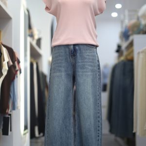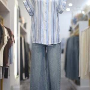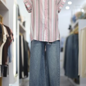 Set áo sơ mi kẻ sọc pastel và quần jeans ống rộng