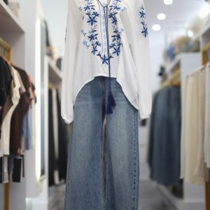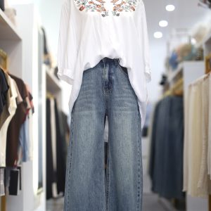 Set áo thêu họa tiết boho và quần jeans ống rộng