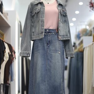 Set áo thun hồng pastel, chân váy jeans midi và áo khoác jeans