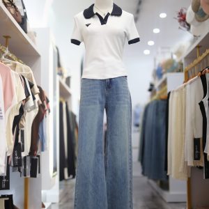 Set áo polo trắng phối viền đen và quần jeans ống rộng