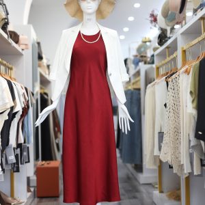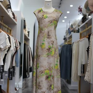Kiểu dáng: Đầm midi dáng suông, cổ V xếp ly, tay sát nách.