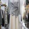 Chân váy satin màu ánh kim là điểm nhấn nổi bật của bộ trang phục. Chất liệu satin mềm mại, bóng bẩy, kết hợp với màu ánh kim lấp lánh, tạo nên vẻ ngoài sang trọng và quý phái. Sự kết hợp giữa sắc trắng tinh khôi của áo và màu ánh kim rực rỡ của chân váy tạo nên một tổng thể hài hòa, vừa thanh lịch, vừa thời thượng.
